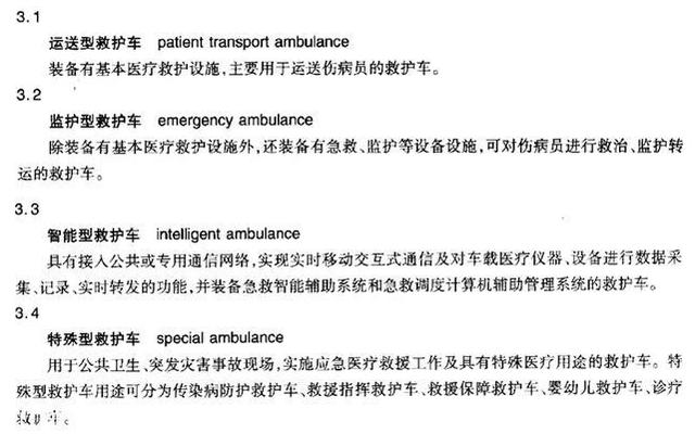 國家質量監督檢驗檢疫總局發布的GB/T 17350-2009《專用汽車和專用掛車術語、代號和編製方法》、工信部2014年3月1日實施的QC/T 457-2013《救護車》、衛生部2008年4月1日實施的WS/T 292-2008《救護車》,都對救護車有著各自的定義。