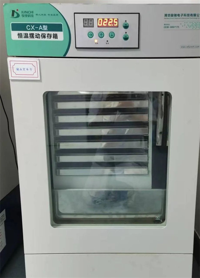 儲血室的各種儀器智能采血設備帶大家了解一下。儲存血小板的恒溫擺動保存箱,溫度在22攝氏度左右,正負2攝氏度。它的主要功能特點是擺動,搖擺的幅度是5厘米。1分鍾擺動頻率是60次左右。